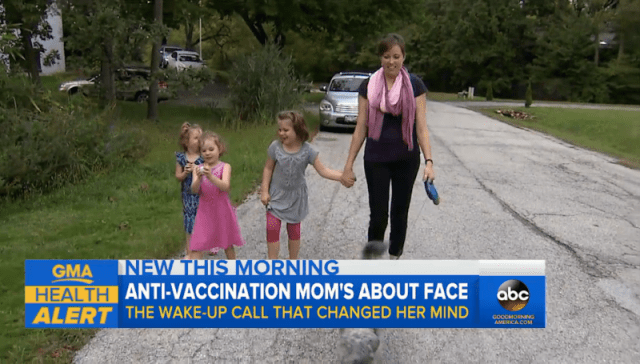 “I put my kids at risk,” she said in an interview that aired on Good Morning America on Monday. “I should have taken more time to research both sides.” and “I scoured everything I could possibly find about why vaccines might be harmful. I became pretty convinced.”